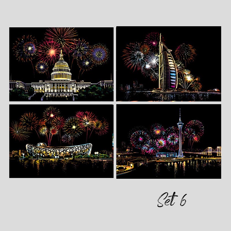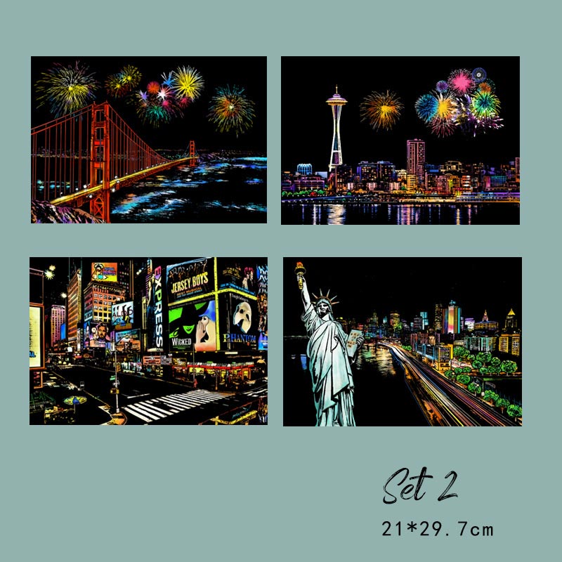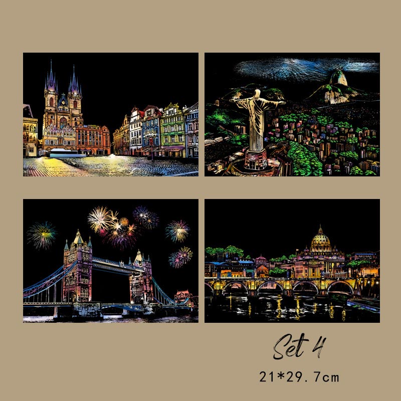 This set includes 4 beautifully designed scenes, offering a fun and relaxing creative activity. Unleash your inner artist as you reveal beautiful cityscapes by scratching off the dark coating.